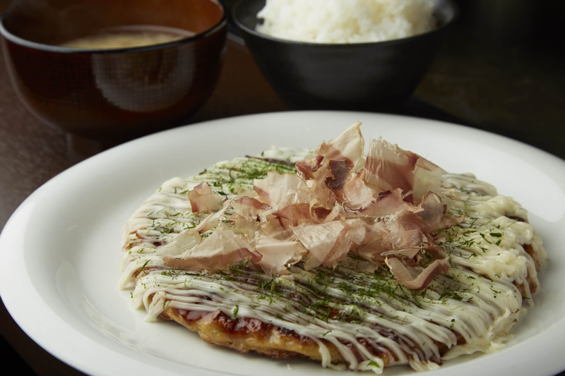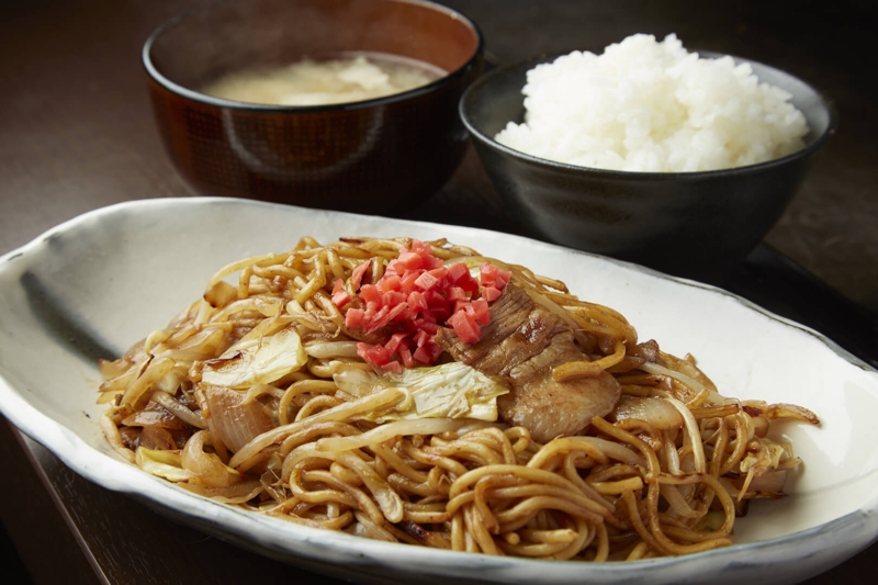 お好きなふわふわ焼、または焼きそばにプラス100円で、ご飯とお味噌汁が付いてくる、ランチタイムだけのお得なサービス。契約農家から取り寄せたツヤツヤのお米とお味噌汁をどうぞ。